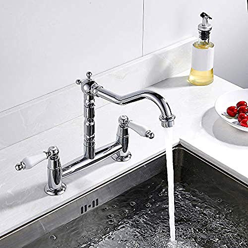XDOUBAO Faucet Rubinetteria per lavello a doppia leva Rubinetti da cucina cromati 1/4 giro 2 fori Rubinetti da cucina a ponte tradizionali da ponte Girevoli a 360 ° Rubinetto per lavabo in ottone