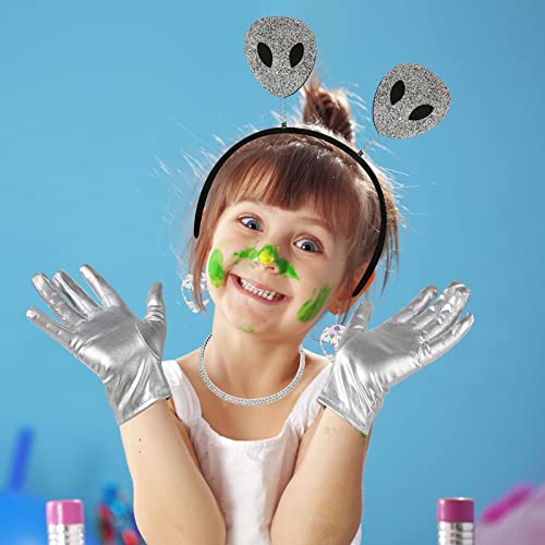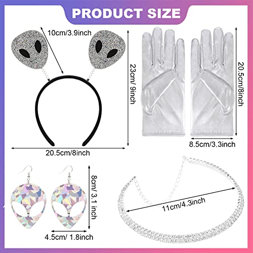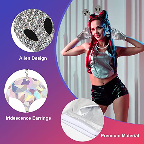 Pacchetto compreso: Il pacchetto include un set di 4 pezzi di accessori a tema alieno, composto da 1 fascia aliena, 1 paio di orecchini alieni iridescenti, 1 collana girocollo glitter e 1 paio di guanti d'argento. Questa combinazione completa di accessori alieni è perfetta per soddisfare le tue esigenze di abbigliamento da festa.