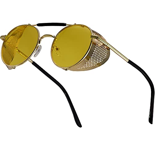 XFentech Occhiali da Sole Steampunk - Polarizzate Occhiali da Sole Retro Stile Steampunk Rotondi in Metallo per Uomo e Donna, A1 Montatura D'oro - Lente Gialle