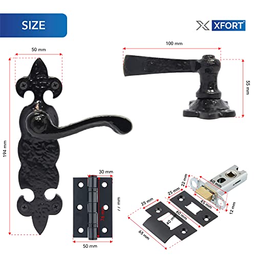 XFORT Smithy's Range Fleur De LYS - Set completo con maniglie per porte, chiusura tubolare da 65 mm e cerniere da 75 mm, maniglie per porte interne in legno.