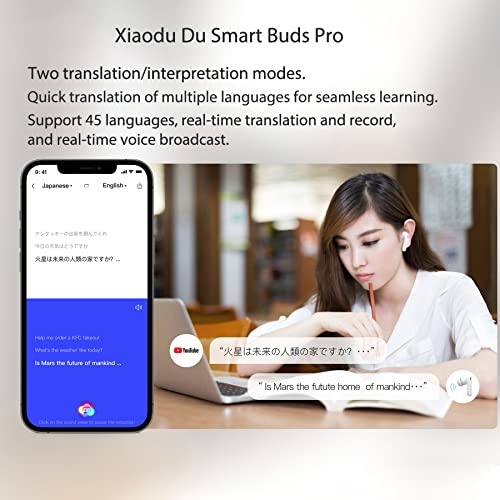 Xiaodu Du Smart Buds Pro cuffie Bluetooth, auricolari wireless con cancellazione attiva del rumore da 40 dB, auricolari per traduttore, interpretazione in 45 lingue, durata della batteria di 35 ore