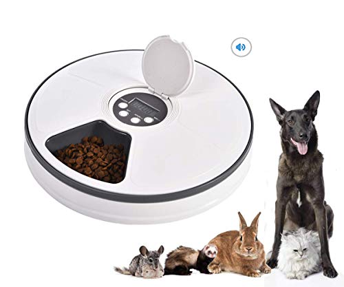 DISTRIBUZIONE DI 6 PASTI : Con 6 scomparti separati alimentari, ogni compartimento ha una capacità di 150g, quindi il distributore di cibo per cani e gatti può distribuire 6 pasti ( i piccoli cani mangiano 6 volte o di più). Può evitare che il tuo gatto o cane affamato anche se si fa tardi di torno o si è fuori casa