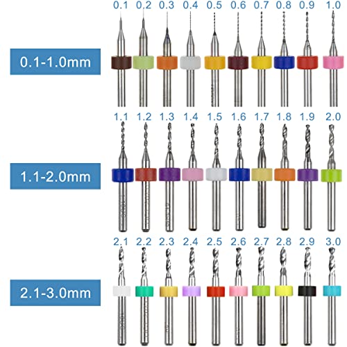 Xiatiaosann Set di punte per trapano PCB, router CNC con scanalatura a spirale da 1/8" Punte da trapano da 0,1 mm-3,0 mm per incisione CNC di circuiti stampati, 30 pezzi