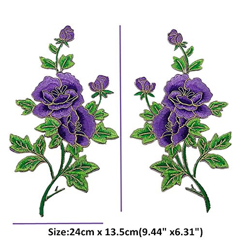 Ximkee - 1 coppia di toppe da cucire o applicare col ferro da stiro, motivo peonie e boccioli di rose con foglie con finiture dorate ricamate Purple