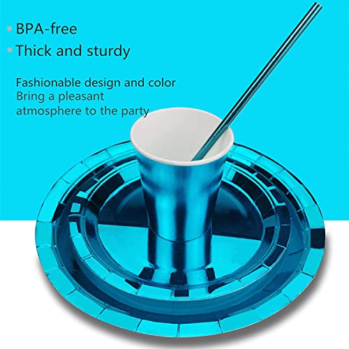 XINLIVE 96 Pezzi Posate per Feste, Riutilizzabili Piatti Carta Natalizi-Set, Includere Piatti, Tazza, Fazzoletto di Carta, Cannuccia, per L'anniversario, Matrimonio, Compleanno (Oro Blu)