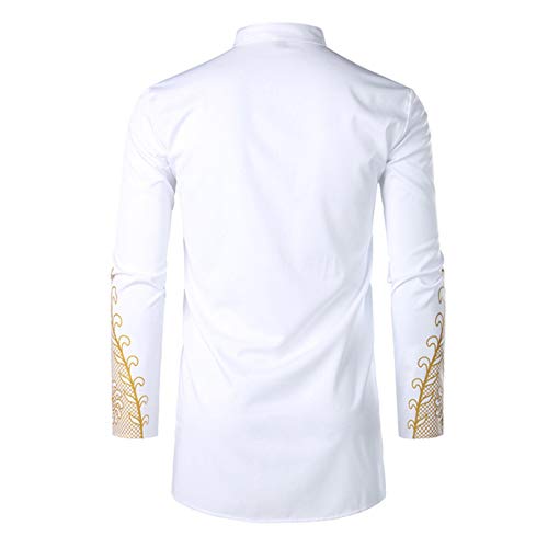 Xinvivion Uomini Musulmani Stampa Bronzo Camicie Africano Dashiki Stand Collare Maniche Lunghe Bottoni Camicie Robe, bianco, M