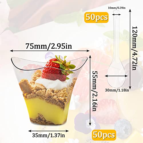 XISUN Bicchieri da dessert in plastica trasparente fai da te per dessert, budino, mousse, feste, 100 ml, 50 pezzi + 50 pezzi con cucchiai