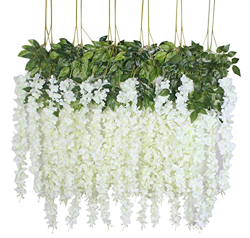 Xiuer Confezione di 12 fiori artificiali di glicine, ghirlanda da appendere, decorazione per cerimonia, matrimonio e casa White