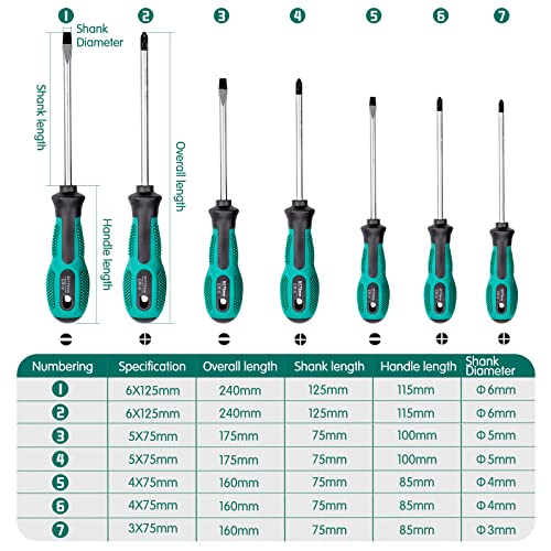 Contenuto della confezione: Ogni confezione comprende i seguenti cacciaviti, 3 a testa piatta (4,0x75 mm, 5,0x75 mm, 6,0x125 mm) e 4 a croce (3,0x75 mm, 4,0x75 mm, 5,0x75 mm, 6,0x125 mm) per soddisfare le diverse esigenze della vita.