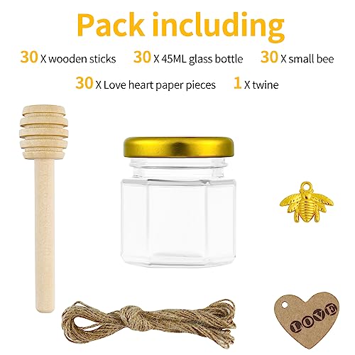 XiYee 20Pcs 45ml Mini Vasetti per Miele Esagonali in Vetro con Mestolo in Legno, Ciondolo a Forma di Ape, Etichette in Kraft, Ciocche di Canapa, Perfetti per Babyshower, Bomboniere per Nozze (20)
