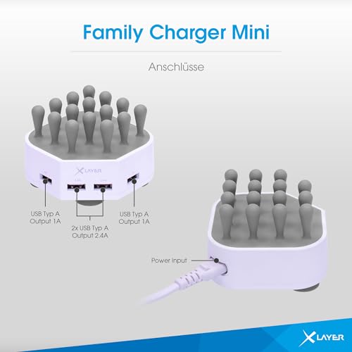 Il caricabatterie USB a 4 porte è compatibile con tutti i dispositivi come smartphone Apple e Android, tablet e altri dispositivi USB come ad esempio Braccialetti per fitness, controller per console di gioco, lettori eBook, smartwatch e dispositivi Bluetooth. Finalmente non ci sono più batterie scariche. Con il caricatore USB puoi finalmente essere certo che tutti i tuoi dispositivi sono caricati quando ne hai bisogno. La presa unica ha terminato l'una. Con la stazione di ricarica da tavolo avrete bisogno solo una presa di corrente e potrete usarlo. finfinfintutti i dispositivi di tutta Ricarica la famiglia senza complicazioni. I gommini superiori della stazione di ricarica da tavolo Multi Charger si adattano in modo flessibile a qualsiasi dispositivo e proteggono la vernice e lo schermo dei vostri dispositivi elettronici