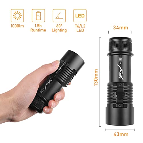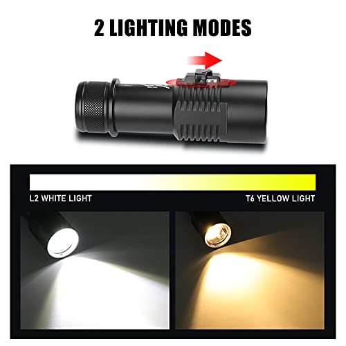 ✅【Torcia Subacquea a Luce Gialla/Bianca】 - Questa torcia subacquea professionale utilizza 1* XM-T6 LED e 1* XM-L2 LED come sorgente luminosa, in grado di fornire 800 lumen di luce gialla calda e 1000 lumen di luce bianca neutra. La luce gialla è più penetrante nell'acqua torbida. La luce bianca consente di vedere chiaramente gli obiettivi fino a una distanza di 100 metri sott'acqua