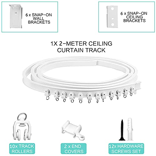 Contenuto Della Confezione: Nella confezione sono presenti 1 binario per tende flessibile da 2 metri, 10 rulli di binario, 6 staffe di montaggio a soffitto, 6 staffe laterali a soffitto, 2 tappi terminali e 12 set di viti e tasselli. Se gli accessori che hai ricevuto mancano, ti preghiamo di contattarci in tempo e possiamo riemettere o rimborsare per te