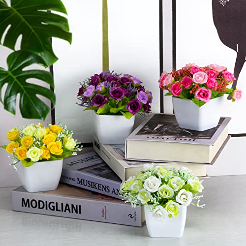XONOR Mini rose artificiali in vaso, in seta, in vaso di plastica bianca, decorazione per casa, ufficio, scrivania, set da 4