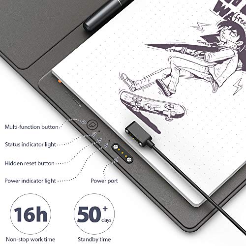 【Un blocco note intelligente ideale per te】 Le dimensioni sono 245 x 176 x 15 mm, pesa 340 g ed è ben progettato. XP Pen Note Plus è un piacere guardare, trasportare e usare. È costruito con una batteria al litio da 1000 mAh, che supporta un orario di lavoro fino a 16 ore. Una caratteristica speciale è la superficie di ricarica magnetica, che offre una ricarica più rapida e semplice rispetto a un'interfaccia micro USB.