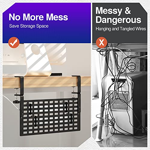 Non c'è bisogno di forare fori: la nostra gestione dei cavi sotto scrivania può essere appesa direttamente ai telai della scrivania e cambiare la sua posizione facilmente come preferisci. Ideale da installare con morsetto su qualsiasi legno, vetro o qualsiasi materiale della scrivania. Viene fornito con tappetini antigraffio sui morsetti, evita efficacemente la clip di graffiare la scrivania.