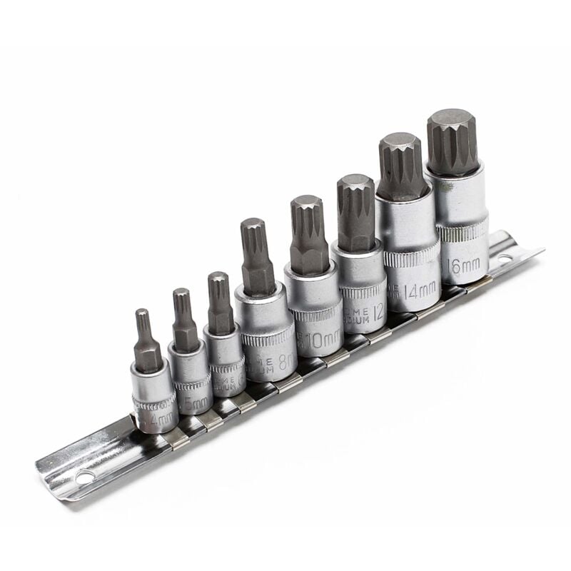 Set di chiavi a bussola da 8 pezzi Tutte le bussole sono zigrinate In acciaio Con supporto in acciaio Con attacco da ¼″, ⅜″ e ½″ Set di chiavi a bussola XZN. Il set include 8 bussole interne multidente nelle misure M4, M5, M6, M8, M10, M12, M14 e M16 e un supporto in acciaio con base scanalata. Il set è composto dalle seguenti bussole M4, M5, M6 con attacco 6,3 mm (¼″), M8, M10, M12 con attacco 10 mm (⅜″), M14, M16 con azionamento 12,5 mm (½″). Il set di utensili è realizzato in acciaio al cromo vanadio, cromato, e viene fornito insieme a una barra in metallo per riporre le bussole.