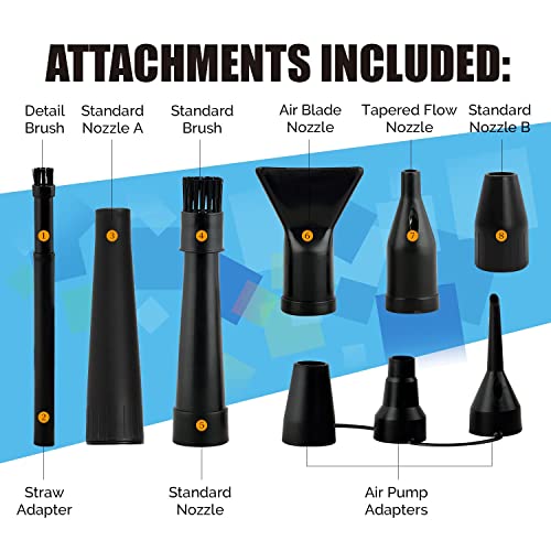 Ugelli variabili: A-2B include diversi ugelli, come l'adattatore per cannucce, la spazzola per dettagli, gli adattatori per pompa d'aria e così via. Diversi ugelli sono adatti a situazioni diverse. Questo design non solo ti consentirà di risparmiare denaro, ma anche di utilizzarlo in casa o in ufficio come versatile spolverino elettrico e pompa d'aria.