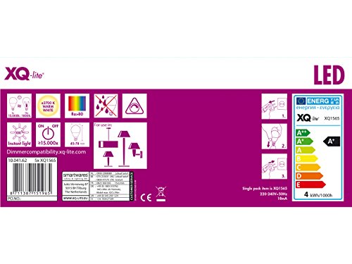 XQ-lite xq1565 - 5 a +, confezione da 5 pezzi LED filamento/dimmerabile/lampadina E14 4 W equivalenti a 30 W, 345 LM, bianco caldo [classe di efficienza energetica A + +], Vetro, 4,5 x 4,5 x 7,7 cm