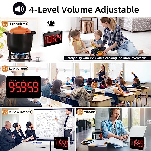 【4 Livelli di Volume Regolabile】- Il timer digitale ha 4 volumi di allarme: Volume alto, Volume basso, Muto e Vibrazione per soddisfare le vostre esigenze specifiche, ad esempio, mentre si cucina, si studia, si lavora, ecc.
