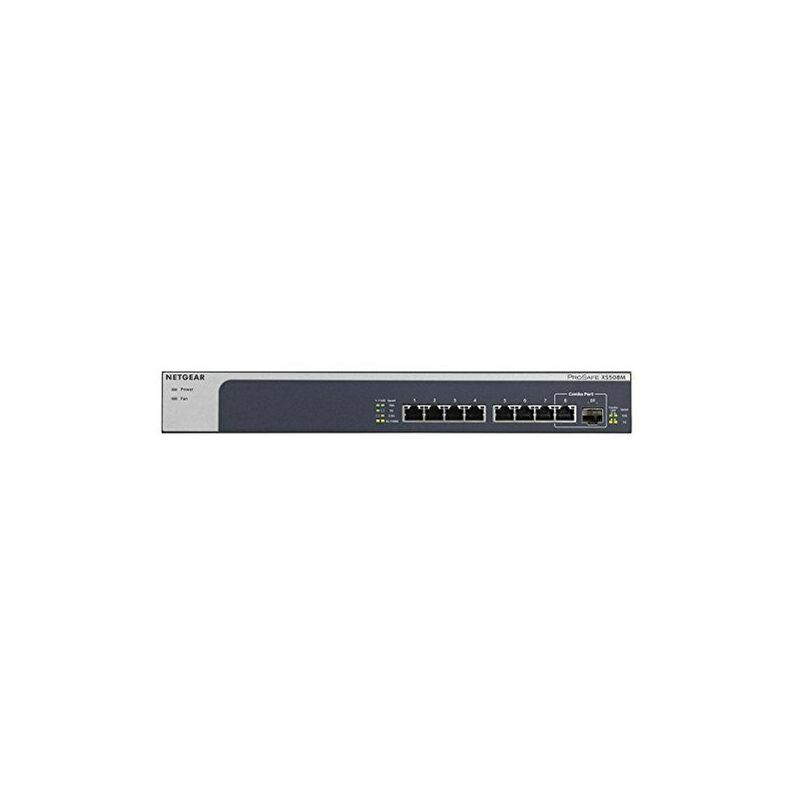 Netgear XS508M. Tipo interruttore: Non gestito. Tipo di porte RJ-45: 10G Ethernet (100/1000/10000), Quantità di porte RJ-45: 7, Quantità di moduli SFP+ installati: 1, Console port: RJ-45. Dimensioni tavola MAC: 2000 voci, Capacità di commutazione: 160 Gbit/s. Standard di rete: IEEE 802.1p,IEEE 802.3,IEEE 802.3ab,IEEE 802.3ae,IEEE 802.3an,IEEE 802.3aq,IEEE 802.3az,IEEE.... Connettore di alimentazione: Jack DC-ingresso. Montaggio rack