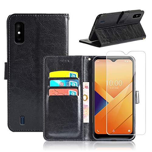 Xswill Cover per Wiko Y81, Nero Morbido Toccare Sensazione PU Pelle Portafoglio Libretto Flip Protettiva Custodia con Uno Vetro Temperato Pellicola Protettiva per Wiko Y81 6.2"