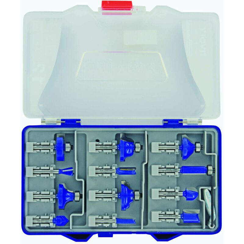12 frese di varie forme con manico da 6 mm > Consente un lavoro facile e preciso su legni duri o teneri, melaminici e stratificati e in plastica. Offre una finitura pulita e un taglio gradevole. Adatto a frese con portautensili da 6 mm. Porta questa scatola sul tuo cantiere e usala su una scala a pioli o una scala in completa sicurezza: la scatola resisterà a ogni possibile caduta. Facile presa e conservazione degli strumenti senza rischio di tagliarsi.