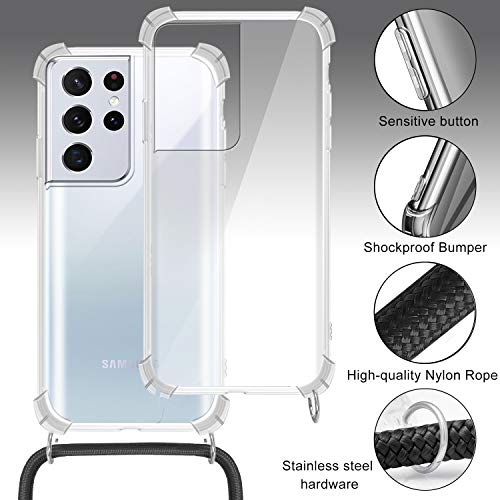 XTCASE Cover con Cordino per Samsung Galaxy S21 Ultra 5G, Custodia Trasparente con Collana Tracolla Laccio Collo Ultra Sottile Morbido TPU Silicone Antiurto AntiGraffio Case, Nero