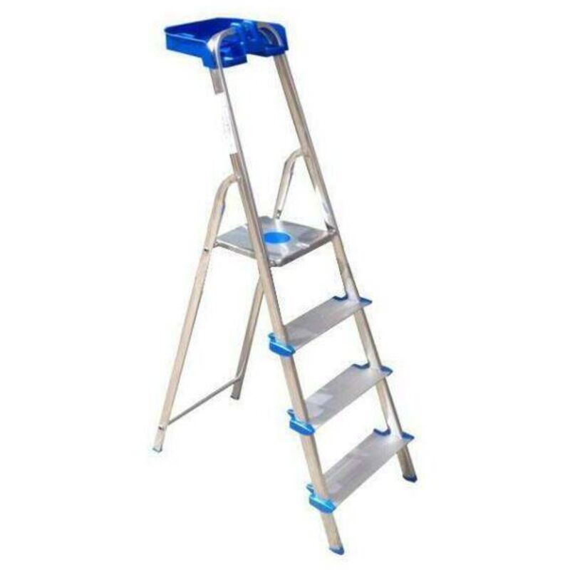 Montanti alluminio sezione mm 40x24 Gradini extra large cm 12 piano zigrinato Tiranti nylon - Staffa con vaschetta multiuso Piattaforma acciaio con zigrinatura antiscivolo Piedini antiscivolo Norme EN 131 - Portata max kg 150