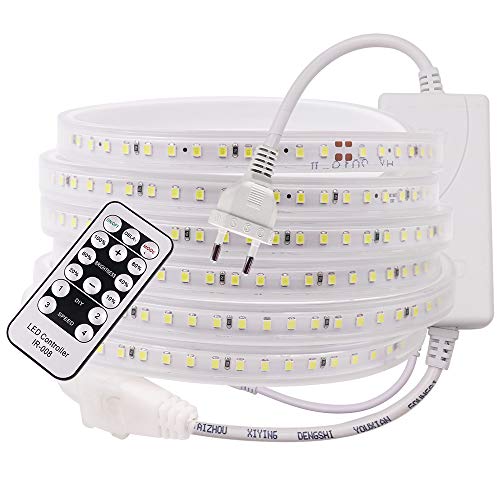 XUNATA 50m Dimmerabile Striscia LED 220V con Telecomando a 15 tasti, 2835 120LED/m, Impermeabile, Flessibile Striscia a LED per Scaletta Tetto Cavi da Cucina Decorazione- Bianco