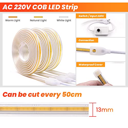 XUNATA Striscia LED COB Dimmerabile 220V con Interruttore, Alta luminosità 360 LED/m, IP65 impermeabile, Nastri LED Flessibile Luce a corda (18m, Bianco Freddo)