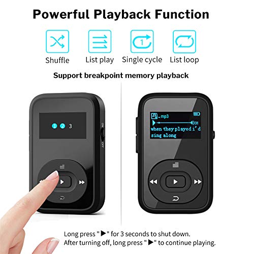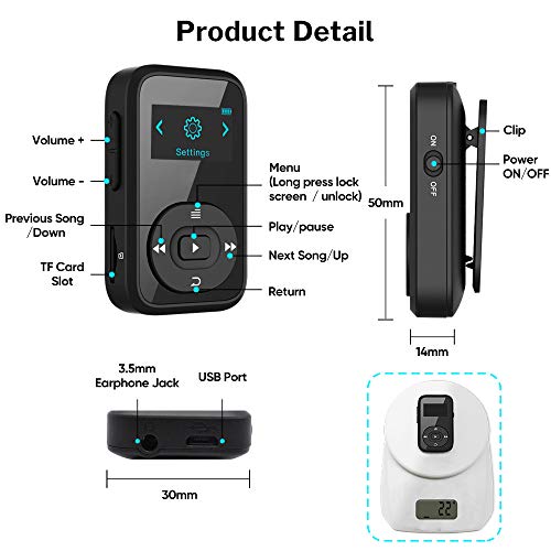 Indietro clip disegno: Il design a clip posteriore del lettore MP3 portatile può essere fermato in qualsiasi punto del corpo, che è conveniente per voi di andare fuori per una corsa, coperta palestra, molto leggero, senza alcuna pressione