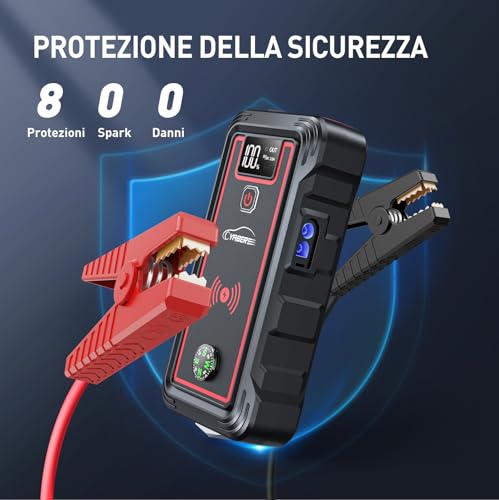 【FUNZIONI DI EMERGENZA】Questo booster avviamento auto può, inoltre, funzionare come torcia e spia luminosa. Ha una bussola d'emergenza e lo schermo LCD mostra la potenza rimanente e lo stato operativo dell'avviatore di avviamento. Le punte affilate in acciaio inossidabile possono rompere i finestrini del veicolo in caso di emergenza.