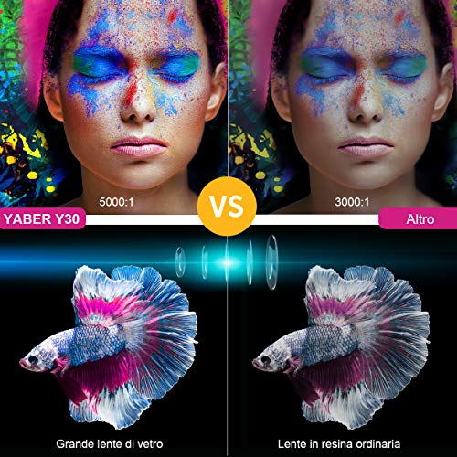 【7200 Lumens & 8000: 1】 contrasto Il proiettore Y30 utilizza una tecnologia di illuminazione avanzata per generare fino a 7200 lumen. Anche in un ambiente che non è completamente buio, la sua sorgente di luce sarà uniforme e chiara.