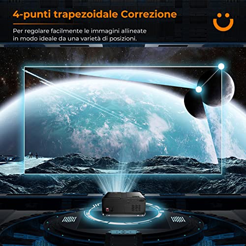 【Correzione trapezoidale a 4 punti e funzione ZOOM al 50%】Con la nuova correzione trapezoidale a 4 punti migliorata, con il videoproiettore V10 si può raggiungere un livello più elevato di correzione e precisione. I quattro angoli dell'immagine possono essere regolati separatamente, non limitati dalla posizione del proiettore. La funzione dello zoom digitale può ridurre la dimensione dell'immagine dal 100% al 50% tramite il telecomando senza spostare il video proiettore.