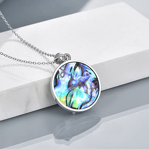 Design Collana con ciondolo luna lupo conchiglia abalone alla moda, il corpo è in posizione verticale, la bocca è aperta, in piedi sotto la mezzaluna, facendo una postura ululante. La luna e le stelle sulla luna nuova annunciano il cielo notturno, avvolgendo il lupo in piedi, proteggendolo tutto il tempo. L'intarsio di lupo con guscio di abalone colorato, misterioso, elegante e affascinante.