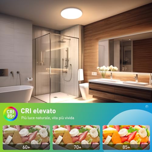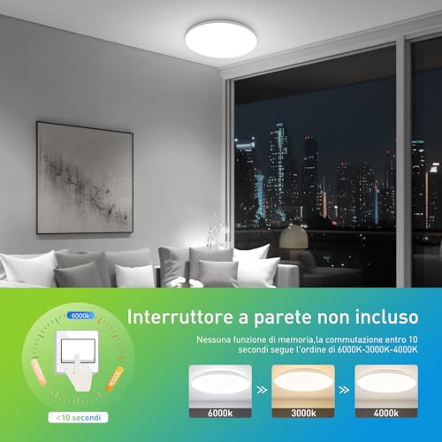 【Temperatura colore regolabile】La temperatura del colore del plafoniera led soffitto può essere regolata dal bianco caldo al bianco neutro e al bianco freddo tramite l'interruttore a parete (interruttore non incluso). Cambiando entro 10S, il plafoniera bagno passa nell'intervallo tra 6000K-3000K-4000K (senza funzione di memoria). Dopo 10 secondi, ritorna alla temperatura del colore originale di 6000K.