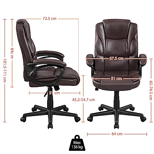 Yaheetech Poltrona/Sedia da Ufficio Ergonomica Presidenziale Scrivania Reclinabile Imbottita in Finta Pelle a Rotelle Girevole Altezza Regolabile Portata 136 kg Marrone