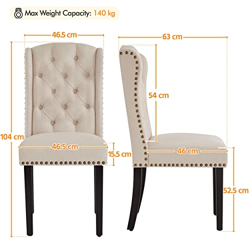 Yaheetech Set 2 Sedie Sala da Pranzo Tessuto Moderne Imbottite Eleganti Gambe in Legno Massello Schienale Alto con Bottoni Portata 140 KG Beige