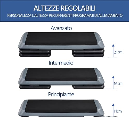 Regolabile a 3 altezze: questo step per fitness è dotato di 4 alzate (2 su ogni lato) e l'altezza può essere facilmente regolata da 11 cm a 16 cm, fino a 21 cm aggiungendo le alzate. Personalizzando l'altezza di questo strumento aerobico, si può liberamente aumentare l'intensità dell'allenamento e bruciare più calorie allo stesso tempo.