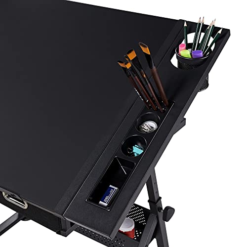 Yaheetech Tavolo da Disegno Inclinabile Altezza Regolabile con Sgabello e 2 Cassetti Scomparti a Matite Scrivania per Disegnatore Pittore Ingegnere Artista Colore Nero