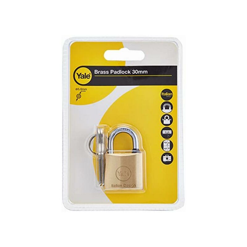 Lucchetto standard in ottone, larghezza corpo 30 mm, arco in acciaio carbonitrurato da 15 mm, con anello in gomma per proteggere i meccanismi interni e doppio sistema di chiusura, fornito con 2 chiavi. Per uso interno. Alta sicurezza e resistenza.