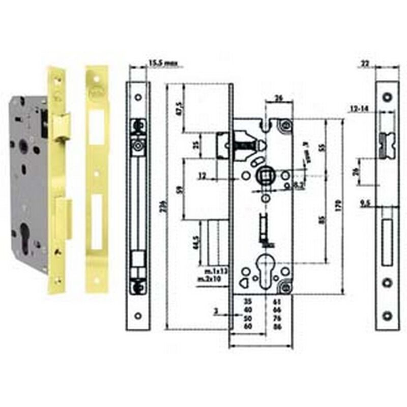 Scatola in acciaio verniciato con fori passanti a norma din per l'applicazione di rosette di sicurezza, frontale e contropiastra con bordo quadro in acciaio ottonato lucido, catenaccio con scrocco biconico reversibile, 2 mandate, cilindro non compreso