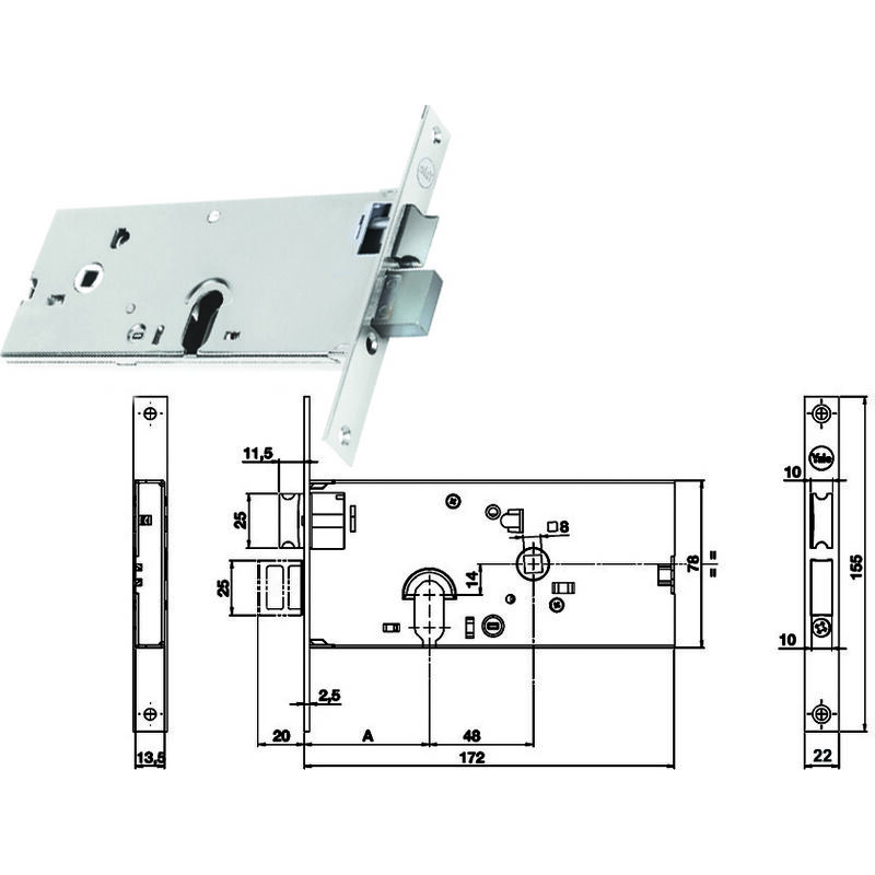 Per fascia alta, frontale in acciaio inox, scatola in acciaio zincato, catenaccio con scrocco separato reversibile con richiamo tramite chiave o quadro maniglia da mm.8 passante, funzionante con cilindro ovale non compreso, scatola mm.78h., interasse mm.48, frontale mm.22