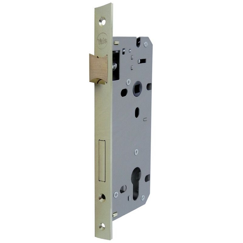 Scrocco e catenaccio una mandata. frontale in acciaio, cassa verniciata. scrocco reversibile. contropiastra con aletta inclusa. interasse 85 mm. senza cilindro.e40 b.quadro -controp.ottone lucido