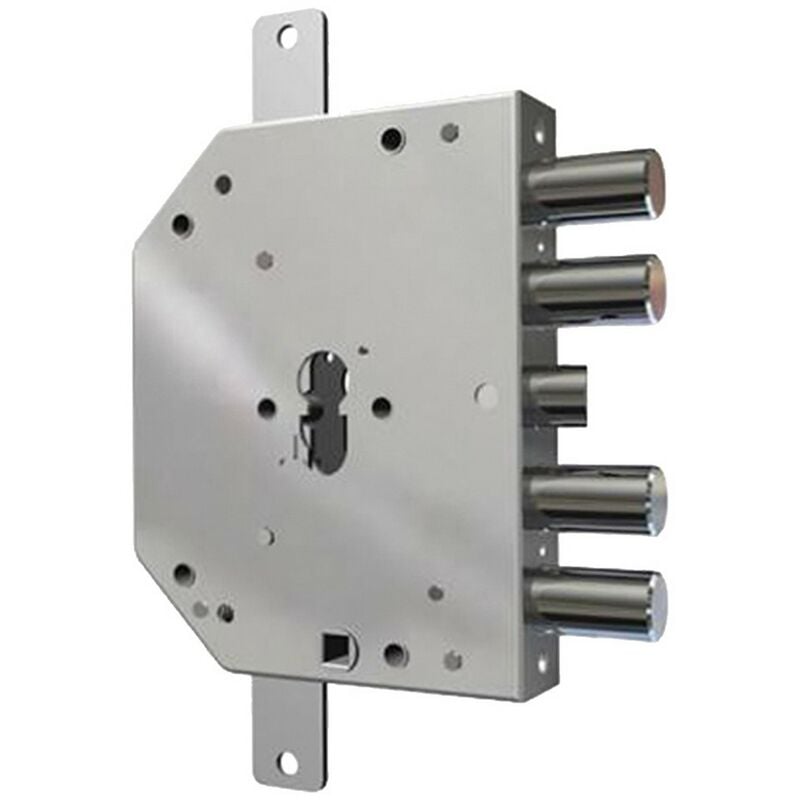 Scrocco reversibile, catenacci ø 18 mm. a 3 punti di chiusura. testata secondo la norma en 12209:2003. dimensioni: mm. 164x130x29,5. fornita senza cilindro.sx - e60