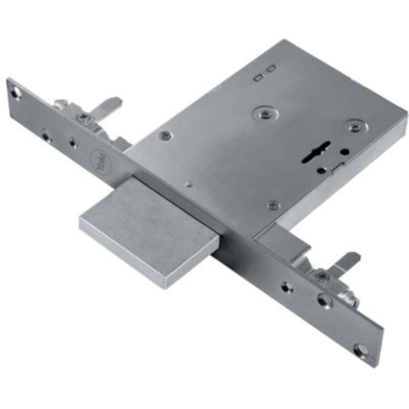 Scatola e frontale in acciaio con rivestimento in zinco, catenaccio in acciaio zincato, 4 mandate ambidestra, dotazione 2 rosette in acciaio, boccole filettate, aste non comprese, 2 chiavi, scatola mm.82h.