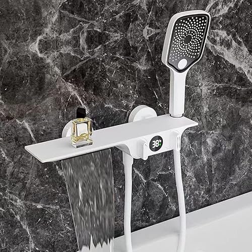 Yalsfowe Rubinetto per vasca da bagno cascata, Miscelatore per vasca da parete ottone, rubinetto per vasca con doccetta, display della temperatura, rubinetto per doccia da bagno,Bianca