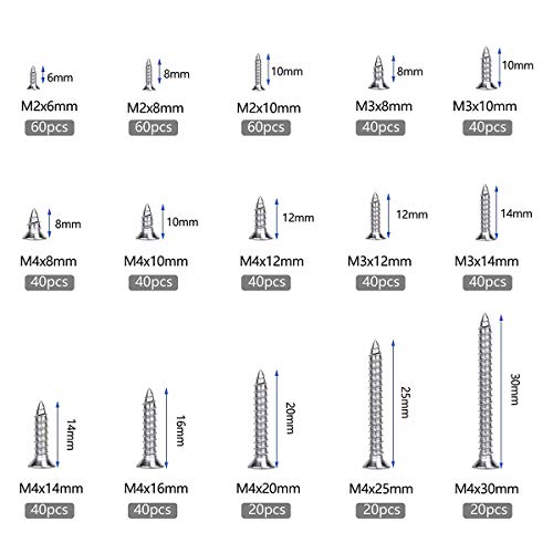 YANGMAN-C Viti Autofilettanti, 600 Pezzi Kit Assortimento di Viti A Testa Piatta M2 M3 M4 Set di Viti Autofilettanti A Testa Svasata con Trasmissione A Croce in Acciaio Inossidabile
