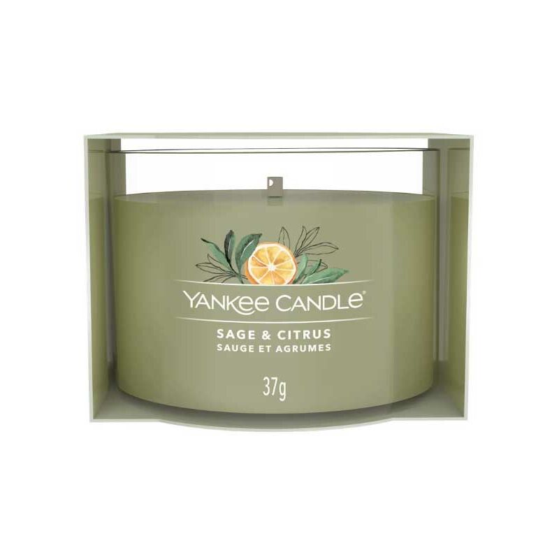 Yankee Candle Candela Votive In Vetro Singola Sage & Citrus, è una fragranza Agrumata. Una miscela di accenti ispirati alla terra al profumo di salvia, combinata con lussureggianti note talcate e che evocano il limone e il lime, per creare una naturale armonia. Note di testa: Note erbacee, Lavanda, Agrumi Note di cuore: Geranio, Lavanda Note di fondo: Patchouli, Note talcate, Muschio, Note legnose Le note di testa sono le note profumate che si percepiscono al primo impatto, le note di cuore costituiscono la struttura principale della fragranza, mentre le note di fondo ne costituiscono la struttura finale. Tempo di combustione: 7 a 10 ore Cera: Miscela di cera di soia liscia che garantisce una combustione pulita e costante. Profumazione: Ingredienti di alta qualità che producono fragranze autentiche ed esclusive Vetro: Aggiungete un tocco di colore alla vostra casa con la cera di questo versatile design in vetro trasparente. Stoppino: In fibre naturali al 100%, rigorosamente testato